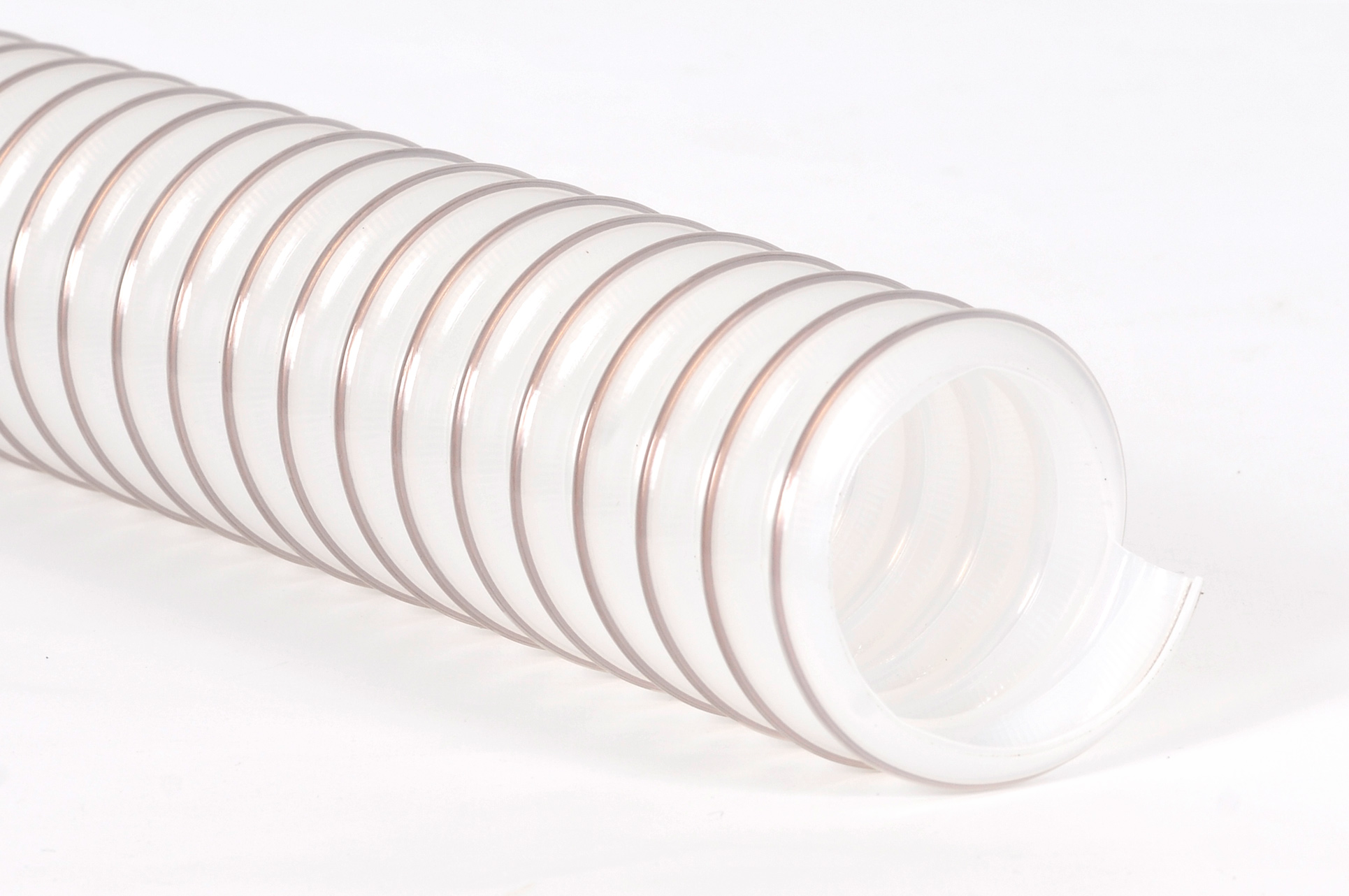 Antistatischer, leichter Absaugschlauch, aus abriebfestem Polyurethan mit in der Wandung eingebetteter, ummantelter Federstahlspirale.